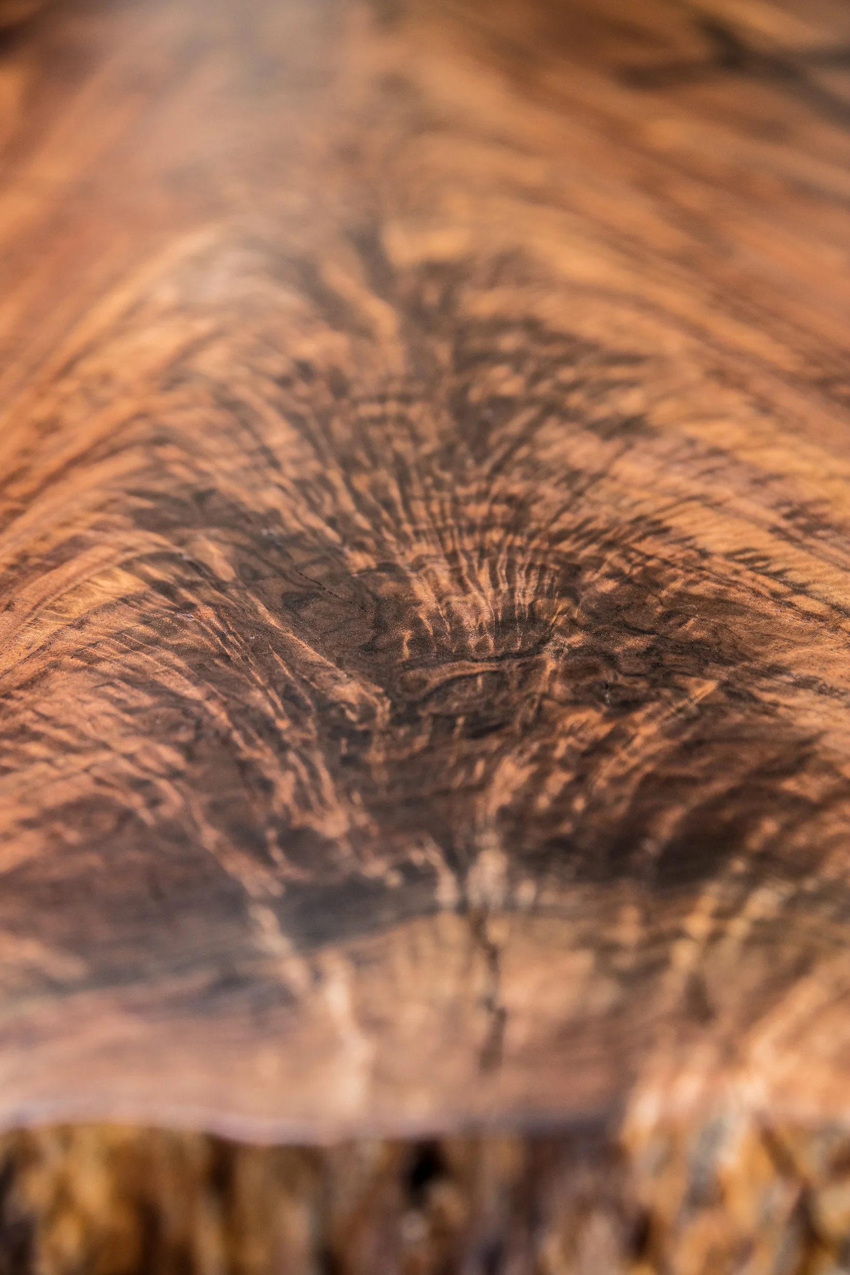 Heartwood can range from a lighter pale brown to a dark chocolate brown with darker brown streaks. Color can sometimes have a gray, purple, or reddish cast. Sapwood is nearly white. Wood from orchard trees that have been grafted with English Walnut may have a colorful/streaked appearance near the graft, which is sometimes referred to as “marbled Claro Walnut.” Claro Walnut can occasionally also be found with figured grain patterns such as: curly, crotch, and burl (source).